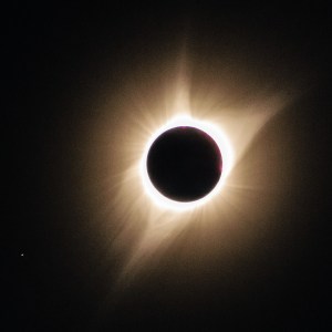 At totality, the blasé crowd erupted. Many started squealing, pointing, and yelling. Mali pointed to a flock of pigeons, the same flock I had spotted on the fence before, tearing through the air. I briefly looked all around to see the 360-degree sunset. I was expecting a deep orange dusk all around up but it failed to appear. We were too close to the mountains. Then I pointed my 16×70 binoculars at the eclipsed sun. Three flares were visible and the corona’s filaments were as beautiful as ever. The corona was not as extensive as the 2001 eclipse and the core region near the sun seemed brighter. I looked around for planets and stars. Venus was easy. I was expecting to spot Mercury and Mars but I the only star I saw near the Sun I later identified as Regulus. I didn’t try to photograph my first total solar eclipse but near the end of totality I grabbed my DSLR and fired off a few 300mm telephoto shots just to see what might come up.