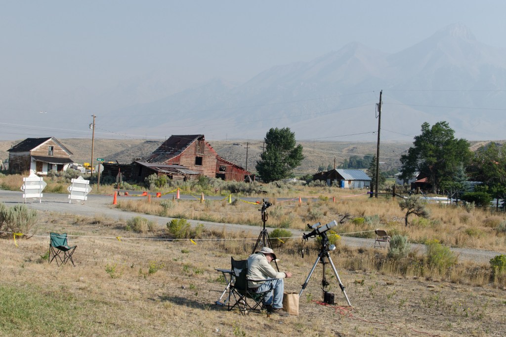 Turning north at Arco Idaho we headed north to Mackay. There was more smoke in the air than I would have liked. The further north we went the thicker the smoke got. When we reached Mackay you could smell the smoke. Mackay sits in a valley. Details on mountains to the east and west were obscured by smoke but the sky was completely clear of clouds and at totality the sun would be high overhead. I worried about smoke’s impact on the corona but I cheered myself up with the thought that sunblock cream wouldn’t be necessary.