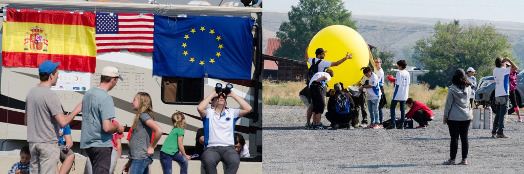 After checking out downtown Mackay I drifted back to the Centennial Rest Stop where Spanish science students were setting up equipment to observe the eclipse. They had come all the way from Spain to watch the eclipse in tiny Mackay Idaho. The moon’s shadow turns even the most unlikely places into tourist attractions. The scientific utility of total solar eclipses in the 21st century is not what it used to be but eclipses do offer great excuses for globe trekking and the re-enactment of historical experiments. The Spaniards were busy preparing weather balloons and getting ready to photograph the corona. They were also making objective lens solar filters for people who brought binoculars and telephoto lens. I considered having some made for my 16×70 astronomical binoculars but decided against it. Instead, I went back to our car, woke up Mali, and then started hauling eclipsing paraphernalia to the viewing area. Unlike many present, we didn’t have a lot of gear: just binoculars, three-legged folding stools, cell phones, cameras, and eclipse shades. Shortly after setting up our stools the Spanish students started counting down to first contact. Shortly after 10:00 am the eclipse started.