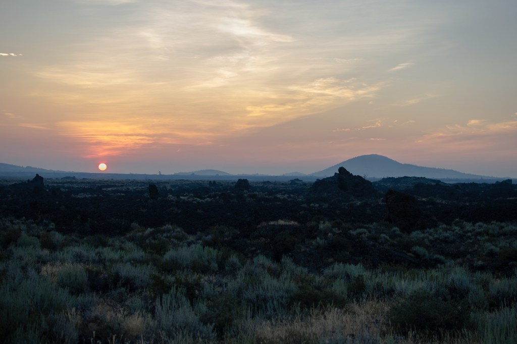 Mackay is about four hours from Meridian. To make it before first contact, shortly after 10:00 am local time, and to miss projected heavy traffic, we started at 4:00 am. In retrospect, we could have left later. Traffic was light on I84 and almost nonexistent on Idaho highway 20. We hardly saw another car until Highway 20 crossed the road to Sun Valley. Sun Valley was in the totality zone but it was too far from the center line for me. Leaving early paid off when we reached Craters of the Moon: a smoke reddened Sun was creeping over the eastern horizon and illuminating the black volcanic flows.
