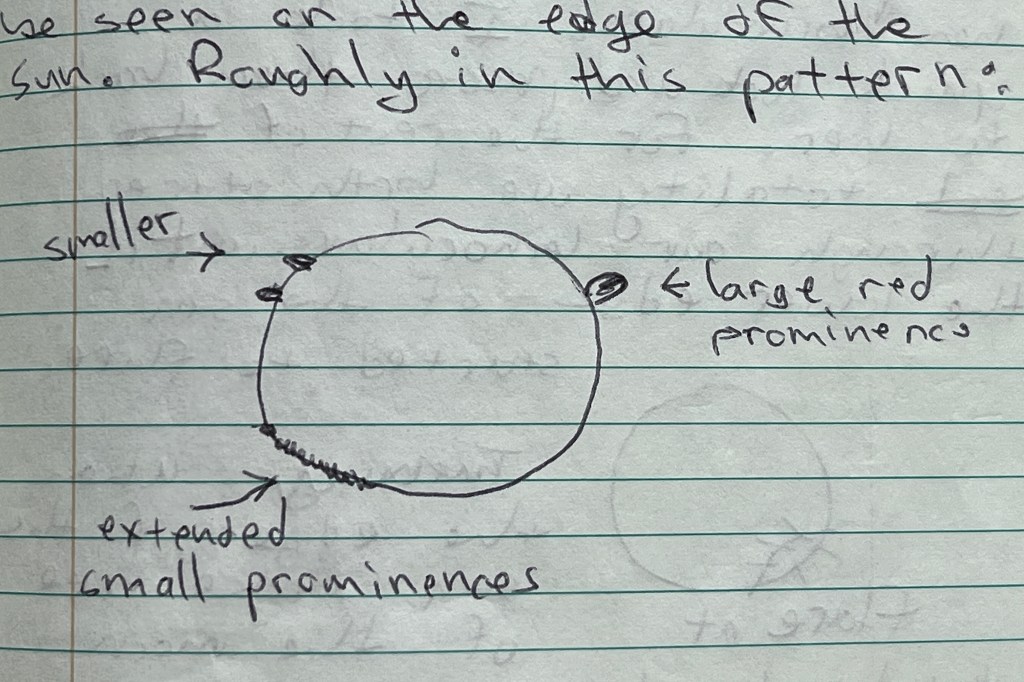 Through binoculars, totality was awesome. The corona was streaming away from the sun, and brilliant red prominences could be seen on the sun’s edge. Roughly in this pattern: